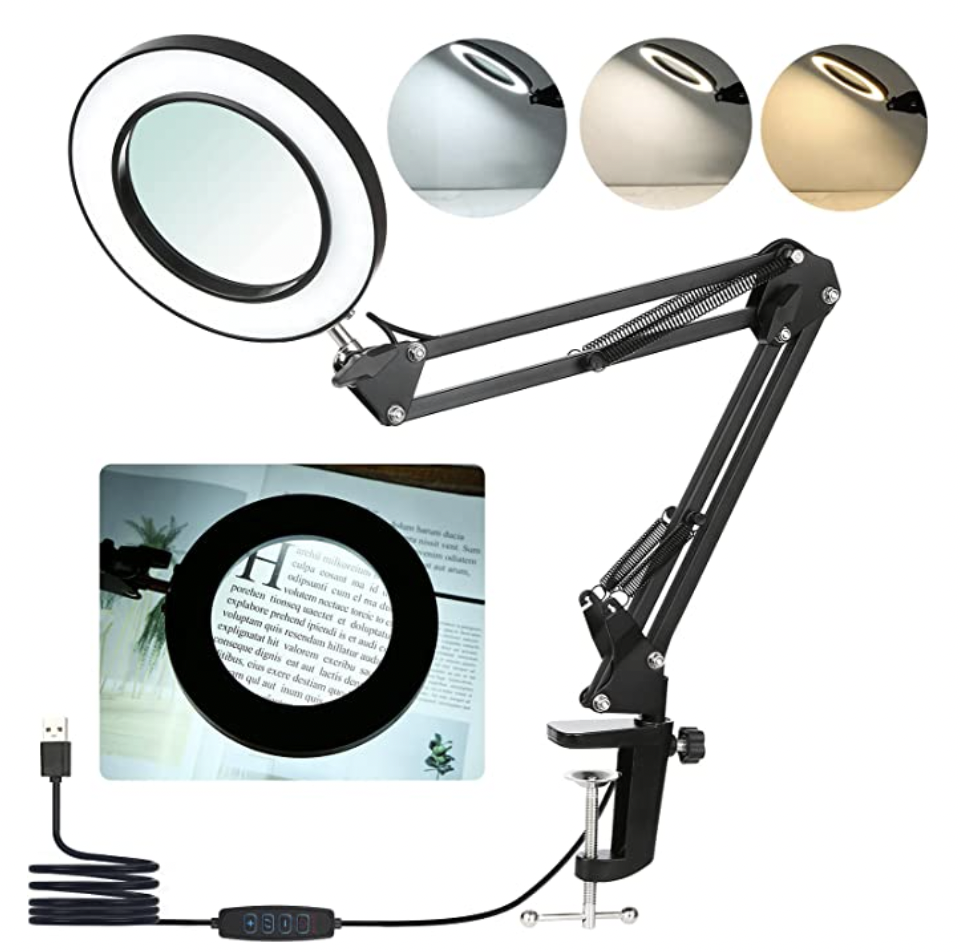 I love using this lamp. It has 3 light setting and 10 dimmers! The warm light and magnifying glass is great for long drawing and sewing sessions. Save your eyes!